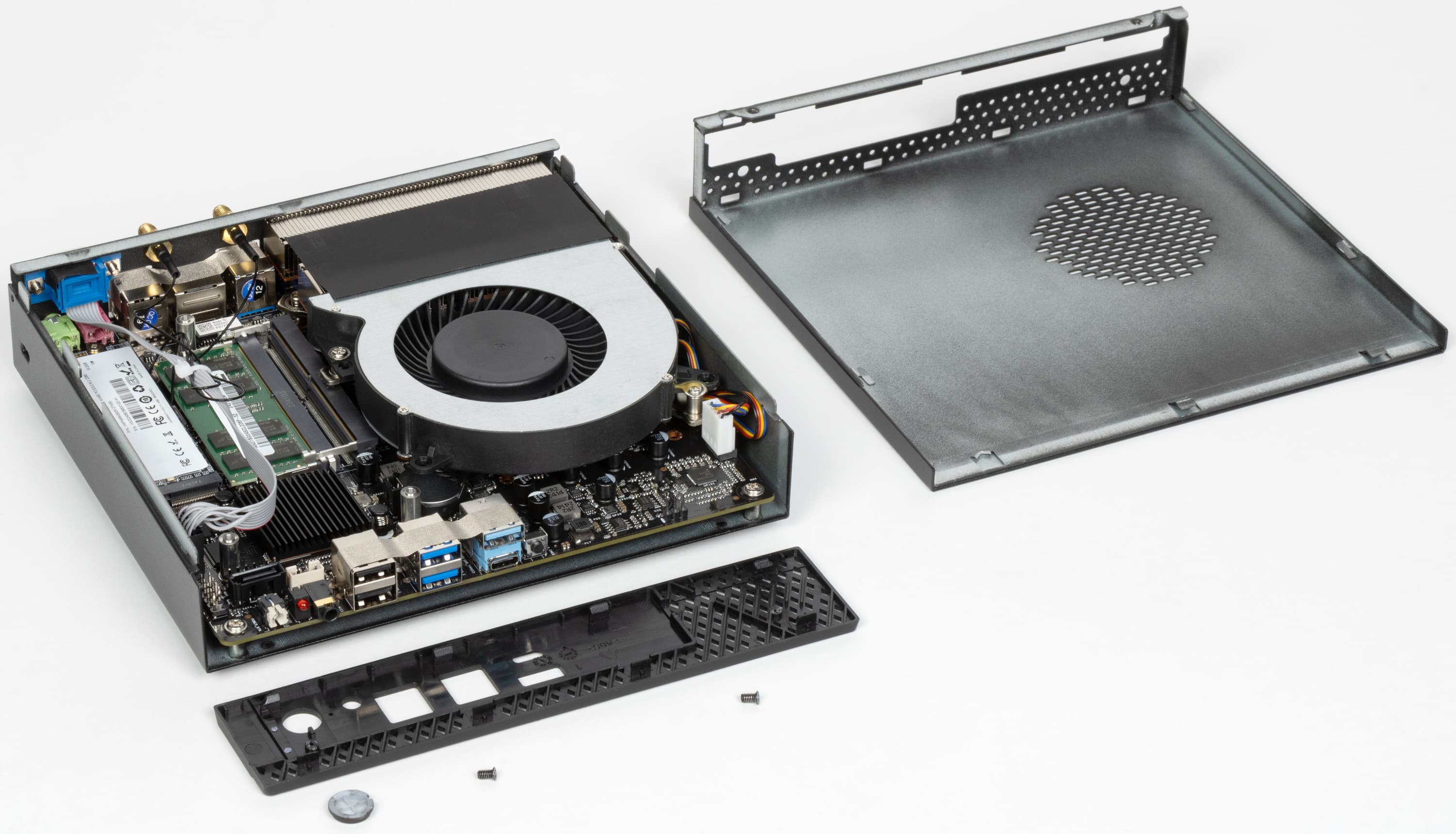 Крышка мини-ПК крепится к корпусу при помощи семи направляющих и двух винтов с крестовым шлицем (Philips Type). Пломбировки или заклейки стикерами нет.