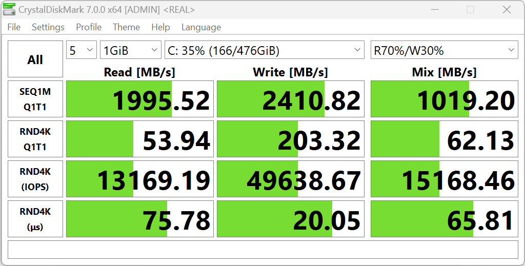 Отчет утилиты HWinfo убеждает в том, что нам предстоить иметь дело с накопителем, обладающим интерфейсом подключения PCIe Gen3 ×4. Проведем его испытания при помощи популярной утилиты CrystalDiskMark.