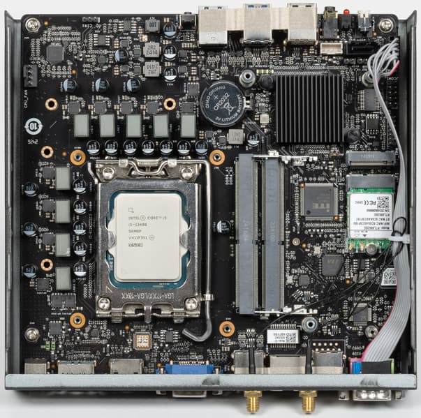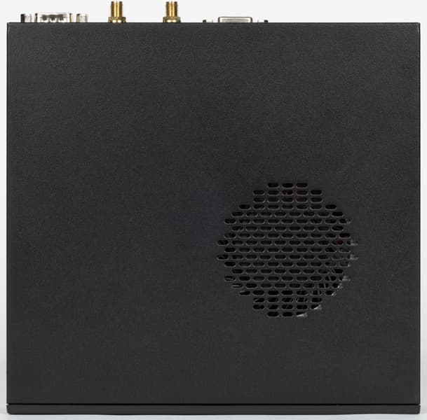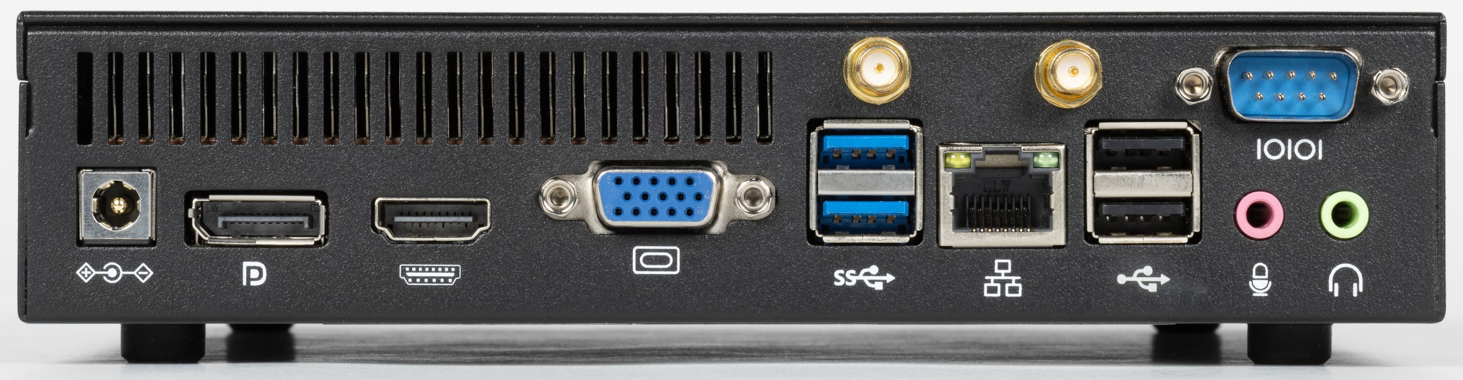 Сзади возможностей для подключения периферии еще больше: гнездо для адаптера питания, видеовыходы DisplayPort, HDMI и VGA, два порта USB 3.2 Gen2 Type A, розетка RJ-45 для кабеля локальной сети 1 Гбит/с, два порта USB 2.0, COM-порт, вход для внешнего микрофона и линейный выход аудио. Наверху заметны щели выходного тракта системы охлаждения, сквозь которые из внутреннего объема машины эвакуируется наружу горячий воздух.