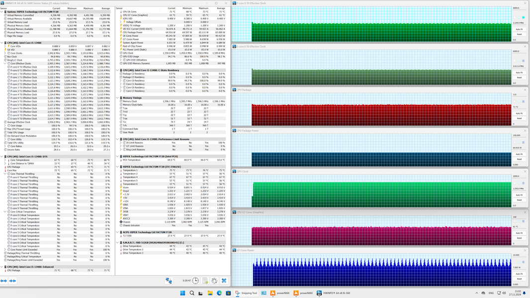 Производитель не снабжает пользователя фирменным приложением для выбора профиля мощности. Поэтому мы испытали работу мини-ПК в обычном режиме под максимальной нагрузкой только на центральный процессор и одновременно на оба вычислителя (нагрузка создавалась приложением powerMax). Приводим ниже таблицу, в которой через дробь указаны максимальные при разгоне и установившиеся в стабильном режиме параметры.