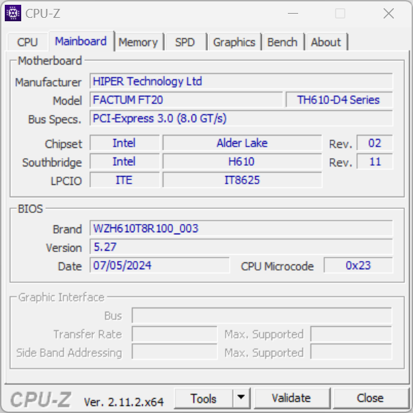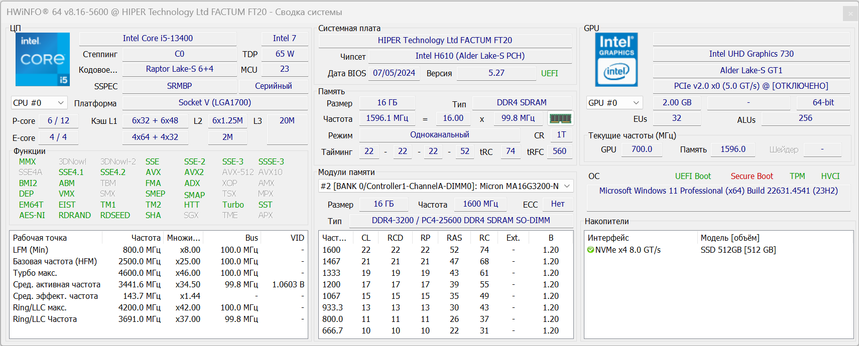 В нашей модели Hiper Factum FT20 был установлен десятиядерный Intel Core i5-13400, с шестью двухпотоковыми высокопроизводительными P-ядрами, работающими при 2,5 ГГц в стабильном режиме и 4,6 ГГц при разгоне, плюс четырьмя однопотоковыми энергоэффективными E-ядрами, работающими при 1,8 ГГц в стабильном режиме и 3,3 ГГц при разгоне. Теплопакет составляет 65 Вт (148 Вт при Turbo Boost).