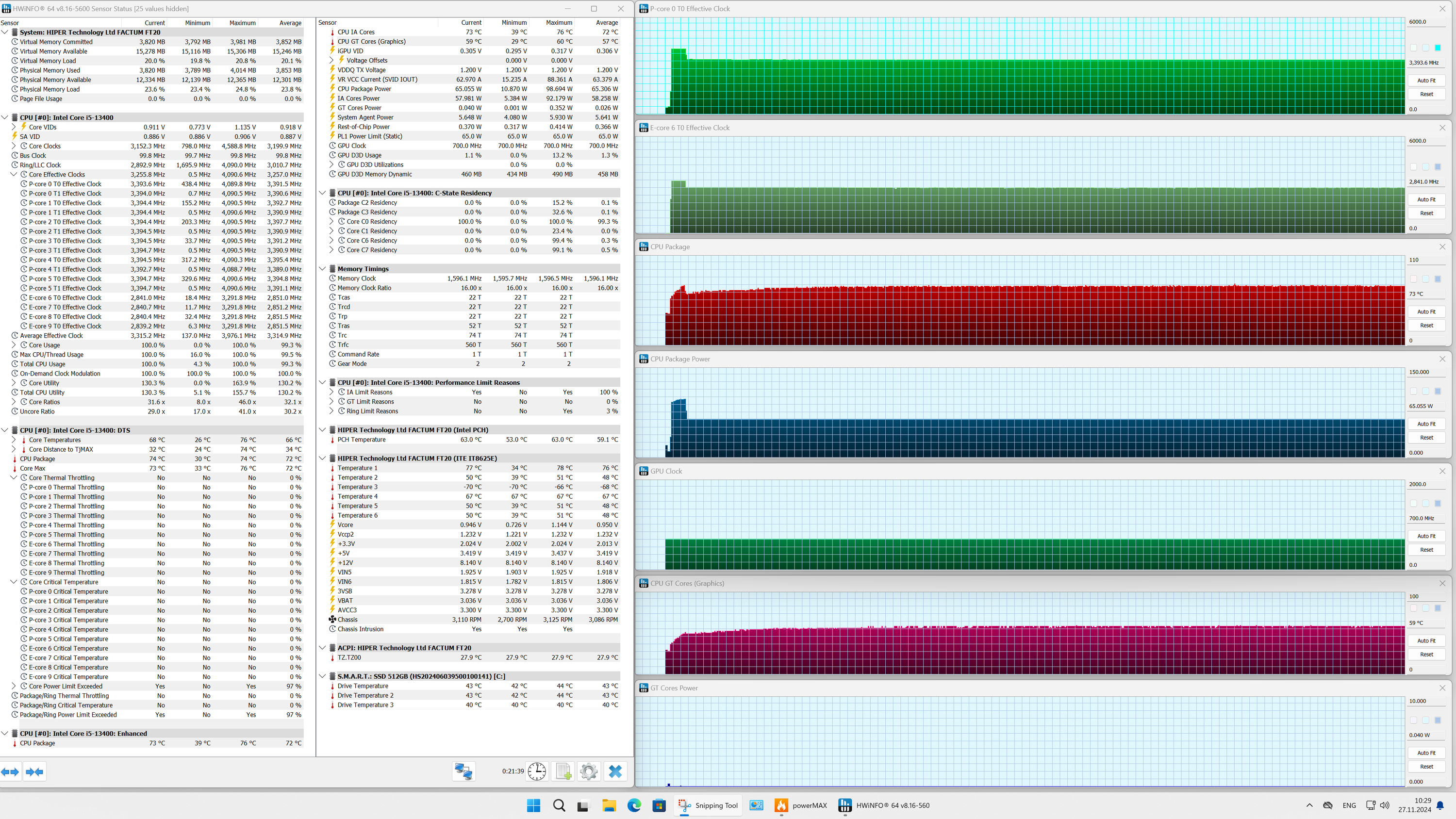 При нагрузке только на CPU начальная активация турборежима весьма отчетливая, длительность составляет 6 с. Потребление процессора в пике — 99 Вт, тактовая частота достигает 4,1 ГГц. По достижении стабилизации отбор мощности падает до 65 Вт, тактовая частота P-ядер снижается до 3,4 ГГц. температура не достигает 76 °C. Естественно, ни перегрева, ни тротлинга мы не увидели.