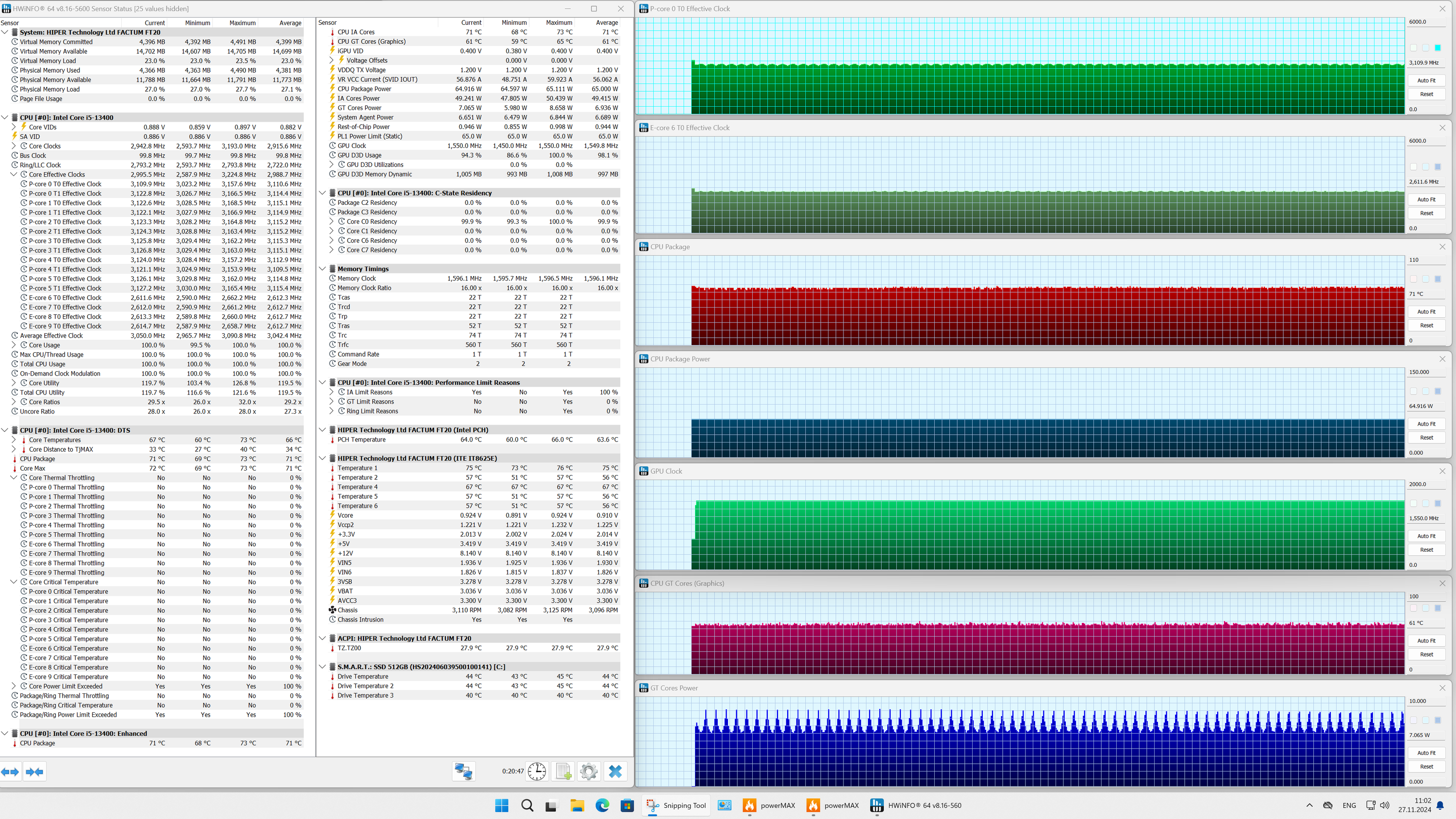 При одновременной нагрузке на центральный процессор и видеоускоритель начальный разгон выражен очень слабо и весьма кратковременен (менее 3 с). Интегрированный видеоускоритель работает на тактовой частоте 1,6 ГГц и потребляет от 7 до 9 Вт. Из-за этих аппетитов CPU отбирает лишь 65 Вт мощности, а максимальная тактовая частота добирается лишь до 3,2 ГГц. Правда, и температура составляет лишь 73 °C при разгоне и 71 °C по достижении стабилизации. Тротлинга не отмечено.