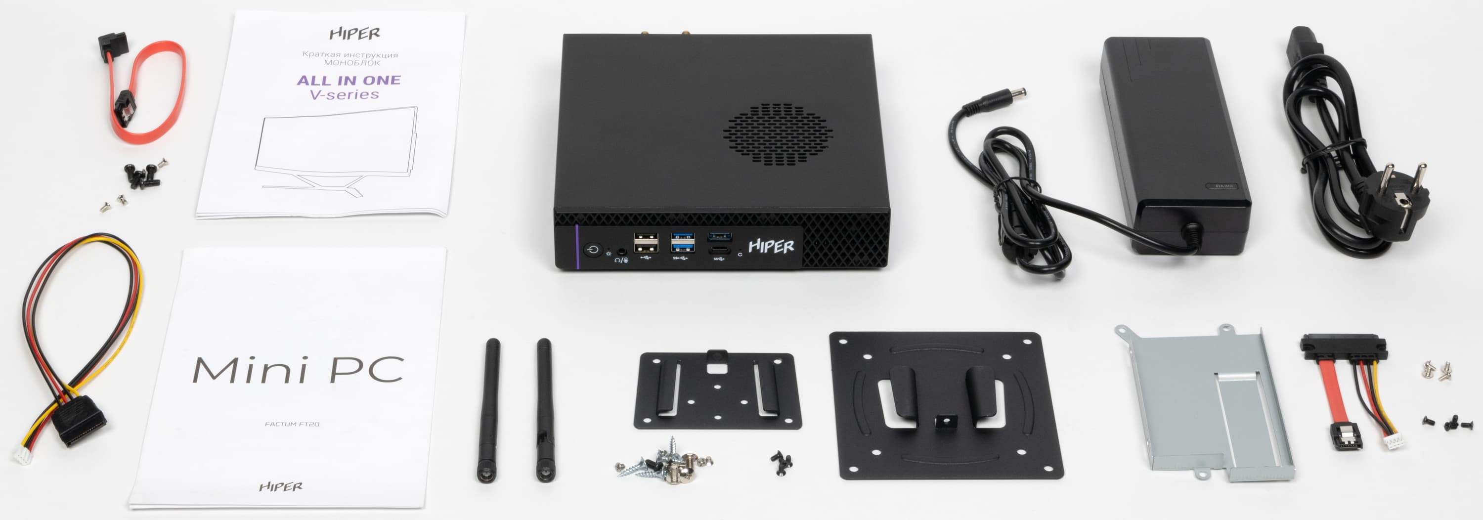 Комплект поставки содержит отнюдь не минимальный набор компонентов. Помимо самого мини-ПК, адаптера питания и Wi-Fi-антенн предусмотрено всё необходимое для установки внутрь корпуса дополнительного SSD-накопителя форм-фактора 2,5 дюйма (интерфейс SATA). Также в коробке найдутся две пластины для крепления машины к задней стенке монитора или к стене (VESA 100×100 и 75×75).