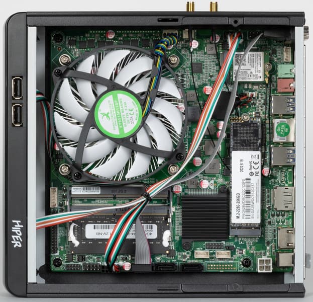 Заострим внимание только на том, что стандартная плата «под сокет» позволяет использовать любые процессоры Core десятого и одиннадцатого поколения с TDP 65 Вт. С учетом последнего условия ориентация на десятое, в общем-то, и правильна — а не только способ сэкономить. К тому же, ниже Core i5 под LGA1200 есть только десятое, а Pentium и Core i3 в линейках Hiper тоже встречаются. Конкретно в M9 есть даже Celeron. Что по нынешним временам совсем скучно, но может быть полезно как раз в расчете на замену на какой-нибудь Core i5-11400. Для офиса смысла в таком немного (и проще сразу уж купить компьютер на Core i5-10500), но если делать на базе компьютера эдакий продвинутый х86-медиаплеер, то более новый GPU этой серии может и пригодиться. Можно и плату легко поменять, хотя проще тогда уж подождать появления в ассортименте Hiper моделей, изначально ориентированных на LGA1700, дабы не иллюстрировать личным примером пословицу шей да пори — не будет пустой поры. А они, безусловно, появятся, но, с учетом основного целевого назначения данной серии, ждать этого не обязательно. Тут пока более важна цена — а «морально устаревшая» платформа может обеспечить более низкую. Поэтому бюджетные платформы и обновляются с определенной задержкой. У всех производителей, а не только у Hiper.