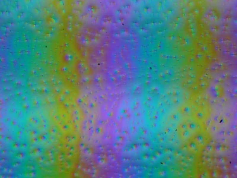 Зерно этих дефектов в несколько раз меньше размеров субпикселей (масштаб этих двух фотографий примерно одинаковый), поэтому фокусировка на микродефектах и «перескок» фокуса по субпикселям при изменении угла зрения выражены слабо, из-за этого нет и «кристаллического» эффекта.