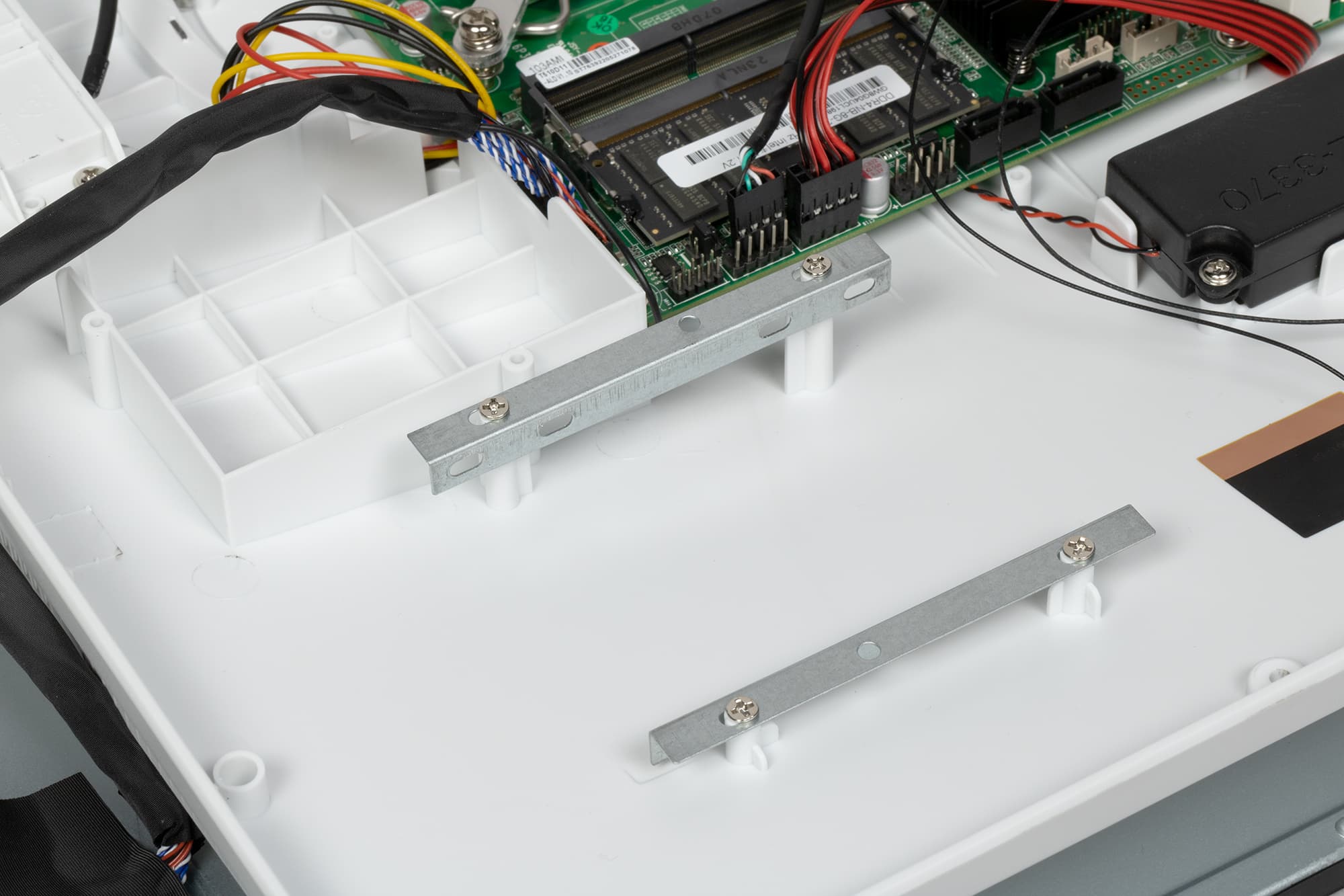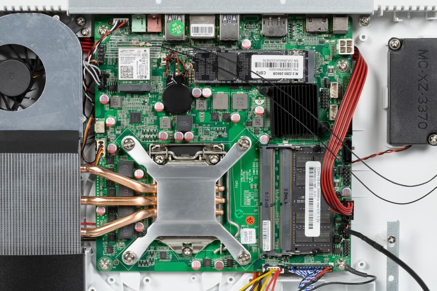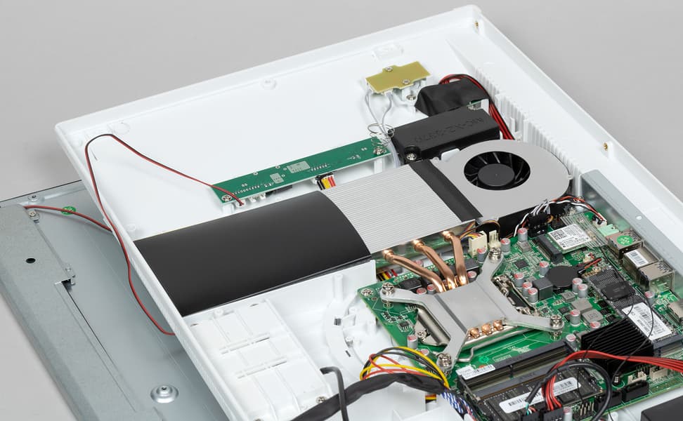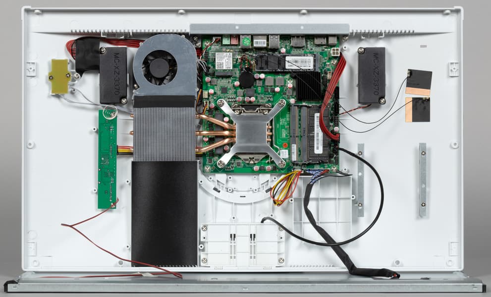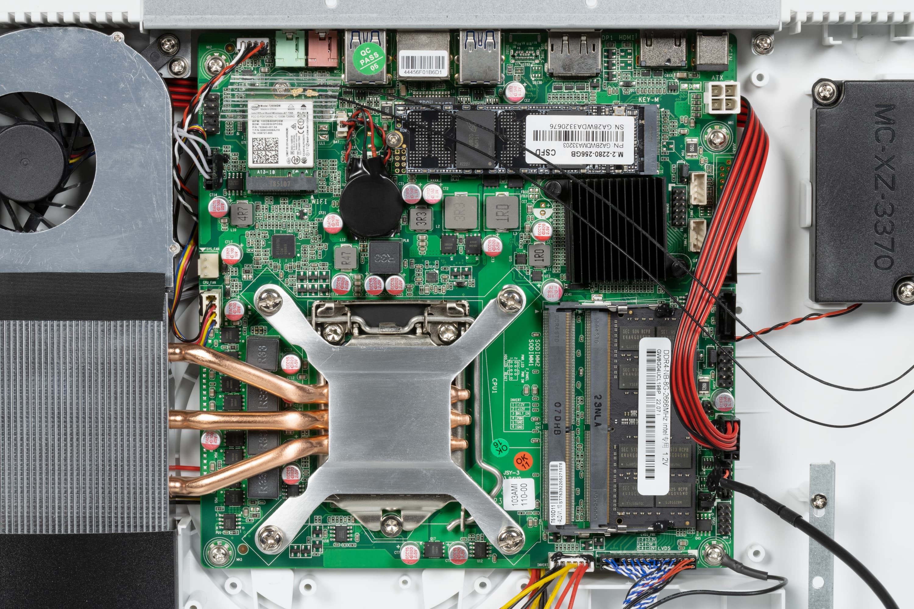 Теоретически есть и возможность модернизации на Alder Lake, благо формат Thin Mini-ITX очень жестко стандартизован (вплоть до расположения процессорного сокета и высоты элементов), но не стоит забывать, что шаг отверстий крепления кулеров для LGA1700 отличается от принятого в линейках LGA115x/1200, так что придется решать проблему с системой охлаждения. Но при сильном желании сделать такой апгрейд — и он возможен. Плата с дисплейным модулем соединяется стандартным LVDS-шлейфом, так что из сложностей остается только, повторимся, крепление кулера.