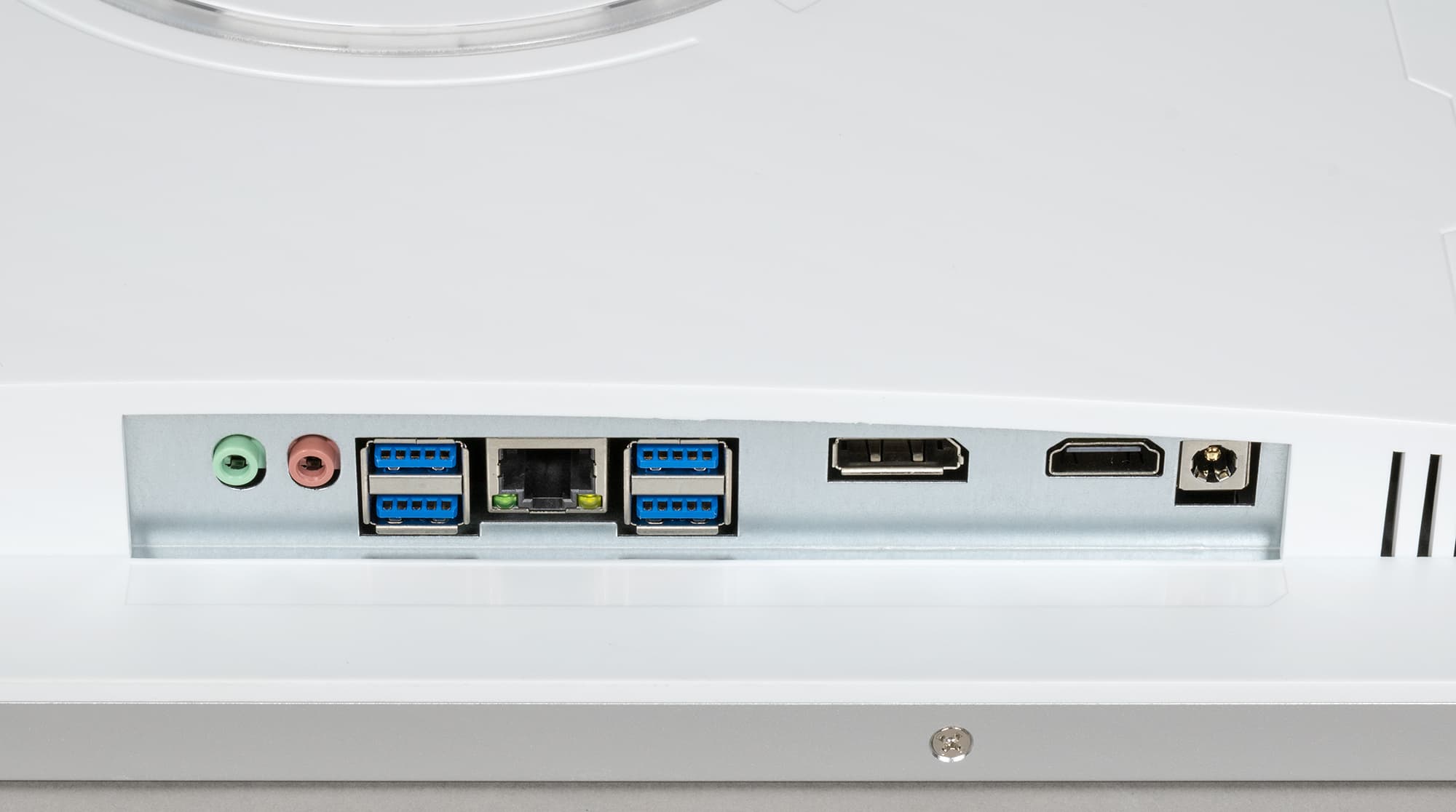 Коммутационные возможности аналогичны более новой модели. Набор портов на нижней грани такой же, что неудивительно — платы одинаковые. Опять заострим внимание на двух видеовыходах, что в моноблоках встречается не так уж и часто, но позволяет при необходимости организовать и мультимониторную конфигурацию. Или пару мониторов — и на телевизор видеосигнал дополнительно вывести, если он недалеко. Тут же находится разъем для типичного ноутбучного блока питания с напряжением 19 В мощностью 120 Вт (так что в случае чего подобрать замену не проблема) четыре порта USB3 Gen1, гигабитный Ethernet и два аудиоразъема — вход и выход.