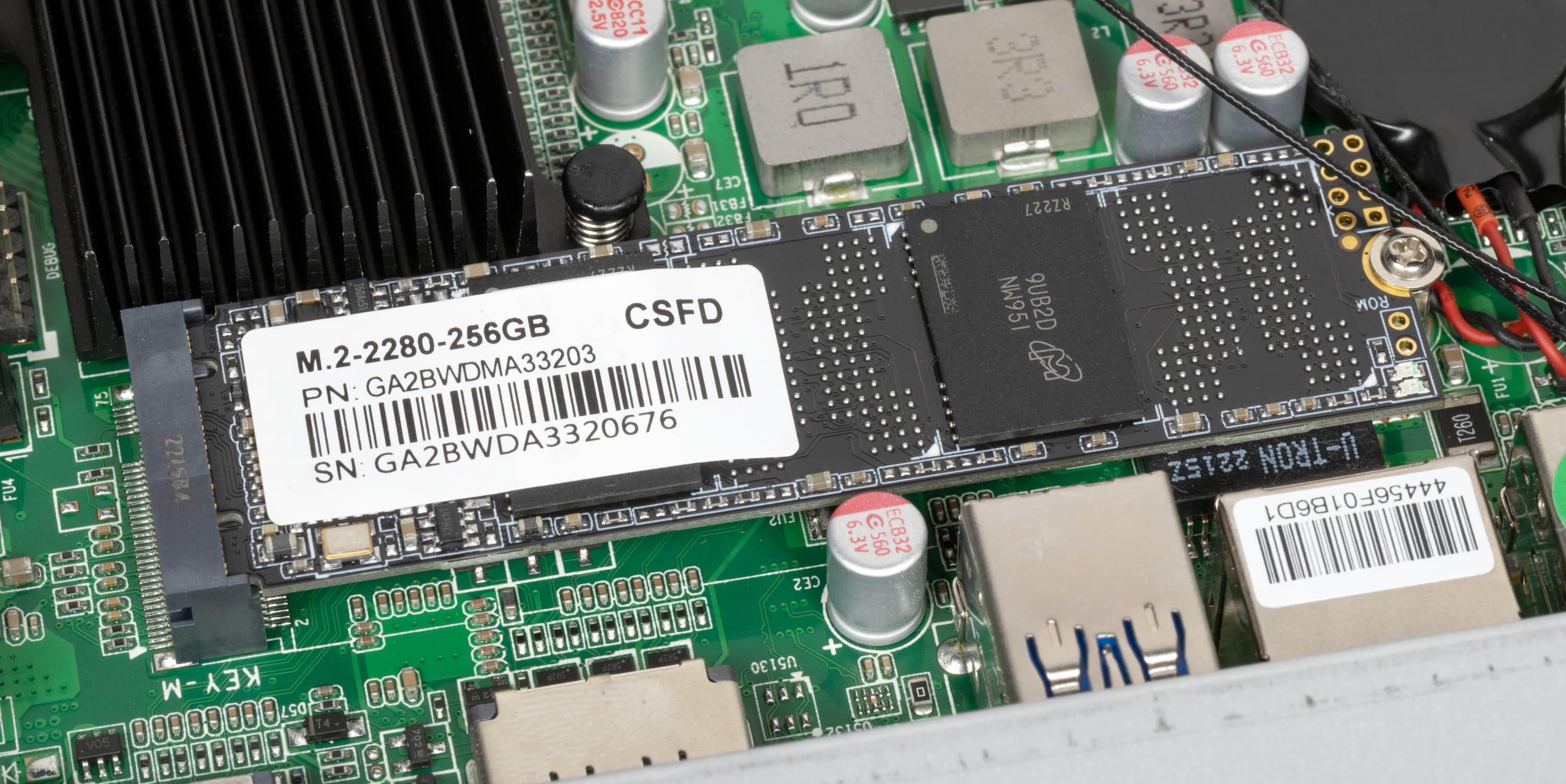 Основной же накопитель в разъеме М.2. Тоже недорогая SATA-модель на безбуферном контроллере YeeStor YS9082HC и 96-слойной TLC-памяти Micron с кристаллами по 512 Гбит, но общая емкость 256 ГБ. При необходимости легко меняется на что-то более емкое и быстрое — благо слот поддерживает и SATA, и PCIe Gen3 x4. Без серьезных требований к емкости и скорости просто достаточное решение. Вся задача которого по большому счету работать быстрее жестких дисков и не жужжать, что и выполняется.