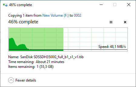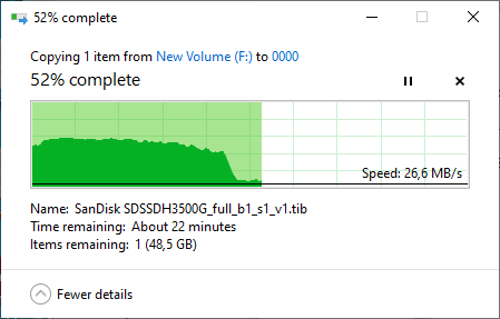 Хотя и в данном случае на какие-то рекорды рассчитывать не стоит. Даже при простом копировании данных в количествах, превышающих емкость SLC-кэш. Вот тут уже «полезность» более емкого накопителя (он на правой картинке) на той же платформе может оказаться видной и невооруженным глазом: «просел» он только на второй сотне гигабайт, да и в куда меньшей степени. Но, повторимся, если производительность в таких сценариях критична, подбирать накопитель нужно самостоятельно. И тут уже «маленький» штатный имеет свои достоинства — его не так жалко менять :)