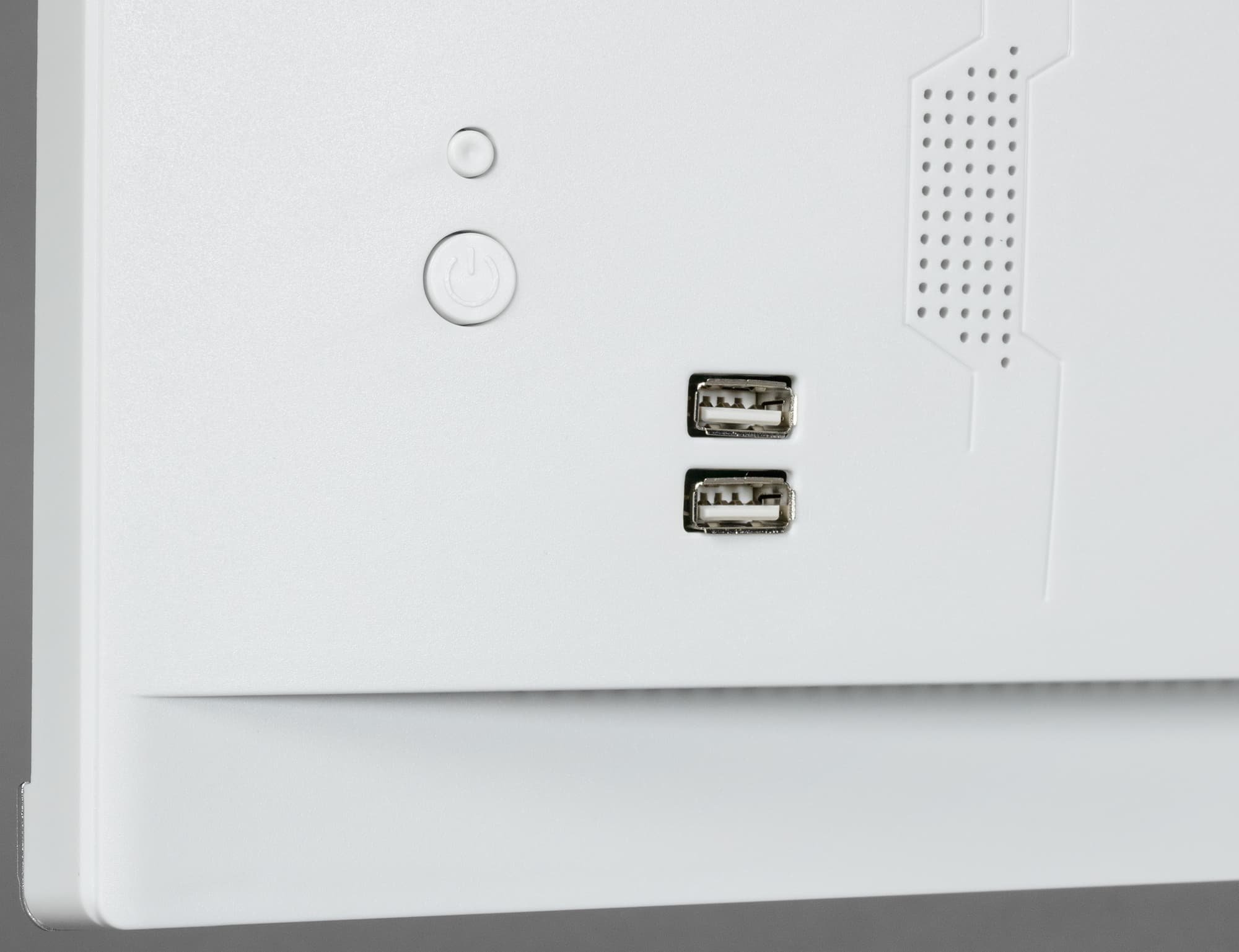 Кроме перечисленного, моноблок снабжен и парой портов USB 2.0. Никаких игр с хабами, низкоскоростным Type-C и прочего — просто пара портов для подключения периферии. Например, штатных мыши и клавиатуры. С учетом назначения, и месторасположение выбрано правильно.