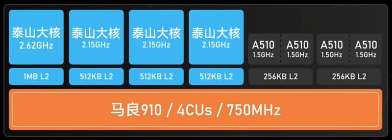 Так что имеем схему ядер Kirin 9000C в таком виде: суперъядро Taishan V120 (2,49 ГГц), 3 больших ядра Taishan V120 (2,15 ГГц) и 4 малых ядра Cortex-A510 (1,53 ГГц). Что касается кэш-памяти, то L2-кэша у средних ядер Taishan по 512 КБ, у суперъядра его уже 1 МБ, также есть по 256 КБ на каждую пару Cortex-A510, а кэша третьего уровня в чипе всего 4 МБ. Есть еще и общий системный кэш (SLC — System Level Cache) для доступа к данным от CPU и GPU ядер объемом в 4 МБ.
