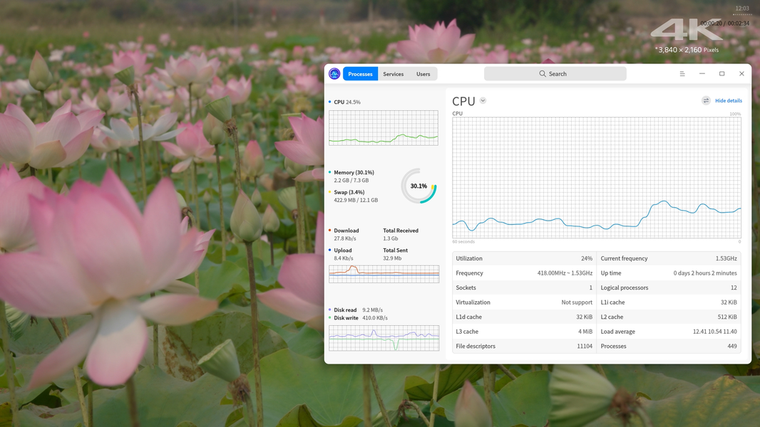 Предустановленные в ОС медиаплееры умеют декодировать 4K-ролики в разных форматах, включая H.265, загрузка CPU в этом случае плавает в районе 15%-25%, в зависимости от битрейта и формата видеоданных. Но в целом хорошо видно, что аппаратное ускорение декодирования видео есть, в отличие от того, что мы видели у системы на основе Loongson.