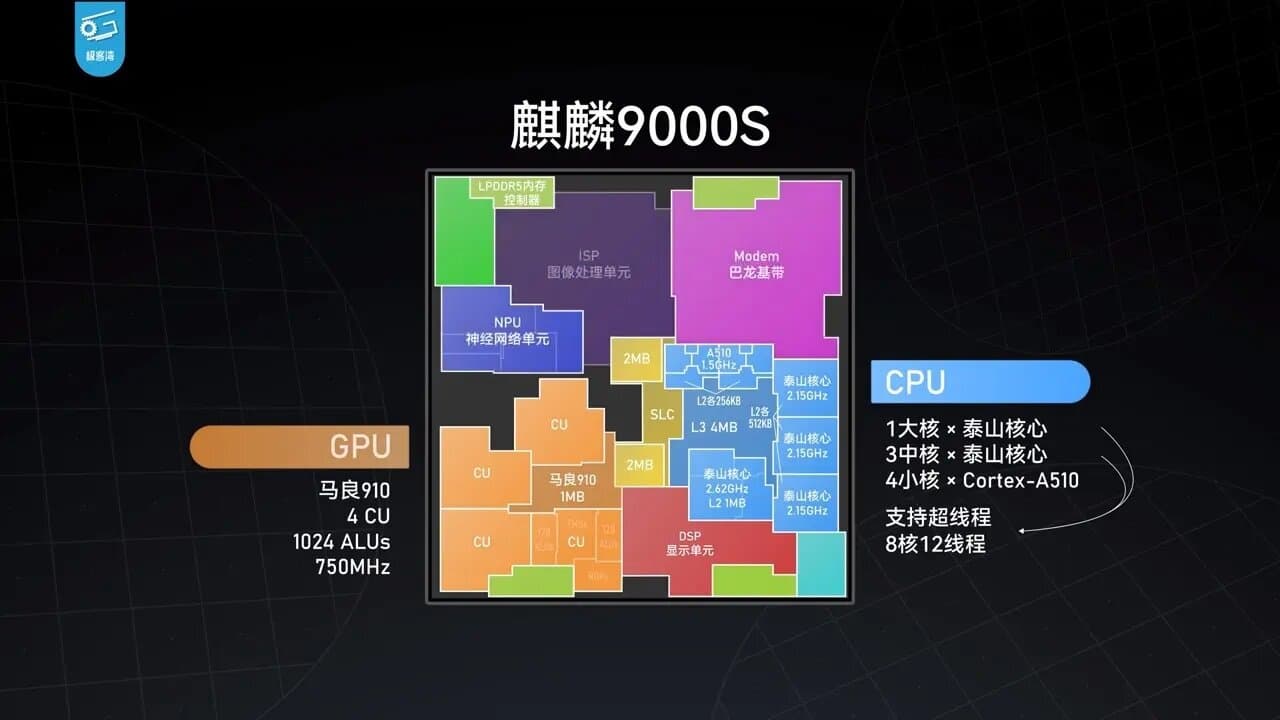 Всё это почти одинаковые решения, отличающиеся отключенной модемной частью (вероятно, W указывает на Wi-Fi) и чем-то еще. А от модели 9000S все они отличаются лишь сниженной до 2,49 ГГц частотой суперъядра. Возможно, урезан также и кэш или еще какие-то блоки, об этом нет никакой информации. Также были выпущены процессоры 9000SL в Nova 12 Ultra и 8000 в Nova 12/Pro — у этих модификаций снижены частоты и/или отключены ядра. Таким образом, Huawei использует отбраковку больших кристаллов 9000S в недорогих смартфонах, а не менее сложные чипы, спроектированные и произведенные специально для менее дорогого сегмента.
