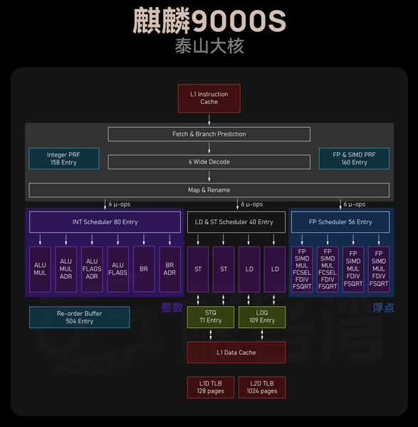 А вот анонсированный еще позднее Kirin 9010 уже имеет отличия в самих ядрах, там уже используются Taishan V121 с увеличенным количеством некоторых внутренних блоков, кэшей и очередей по сравнению с Taishan V120. Усложнение ядра привело к снижению его частоты, и для чуть улучшенного суперъядра в Kirin 9010 она ограничена еще сильнее — уже на уровне 2,35 ГГц. Если пойти еще чуть дальше, то по-настоящему заметное улучшение произошло уже в больших ядрах совсем свежего Kirin 9020, анонсированного в ноябре 2024 года — его суперъядро работает на частоте 2,50 ГГц и имеет более широкий декодер (8-wide против 6-wide), вдвое больше FP-блоков, а также большее количество многих других блоков и буферов вычислительного ядра. Кроме этого, в этом SoC даже самые маленькие ядра заменены решениями собственного дизайна, а не взятыми у ARM. Но не будем забегать вперед, сегодня мы исследуем Kirin 9000C годичной давности, который, скорее всего, схож со столь же устаревшим Kirin 9000S, поэтому мы рассматриваем их возможности.