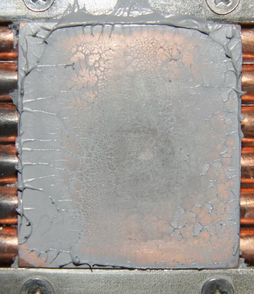 Несмотря на удобный аппликатор у термопаст Iceberg Thermal, мы наносили все термопасты в виде большой капли по центру крышки процессора. Отметим, что по нашей оценке крепление используемого кулера обеспечивало очень сильный и равномерный прижим подошвы к крышке процессора. Дополнительно к давлению, для лучшего распределения термопасты мы несколько раз смещали подошву кулера с прижимом после наживления крепежных винтов, и только потом окончательно их затягивали. Характер распределения термопасты на подошве снятого после тестирования кулера и на крышке процессора свидетельствовал, что термоинтерфейс действительно распределялся достаточно равномерно и тонким слоем. При отрыве подошвы от крышки процессора слой все же разрушался, и, в зависимости от вязкости термопасты, образовывались структуры с валиками (низкая вязкость) или разрывами (высокая вязкость). Отметим, что крышка данного процессора не идеально плоская, а слегка выпуклая, поэтому по центру наблюдалась область плотного контакта, где слой термопасты был минимальной толщины, тогда как к краям толщина слоя термопасты увеличивалась.