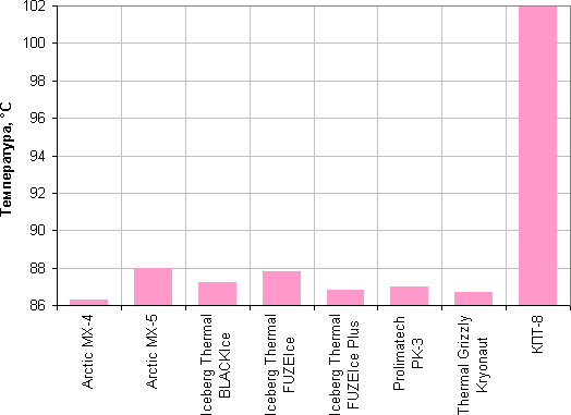 Наглядно видно, что эффективность семи термопаст (напомним, что Iceberg Thermal FuzeIce и BlackIce — это, по сути, одна и та же термопаста) примерно одинаковая, и в данном случае они позволяют снизить температуру процессора на 14-15 градусов в сравнении с КПТ-8.