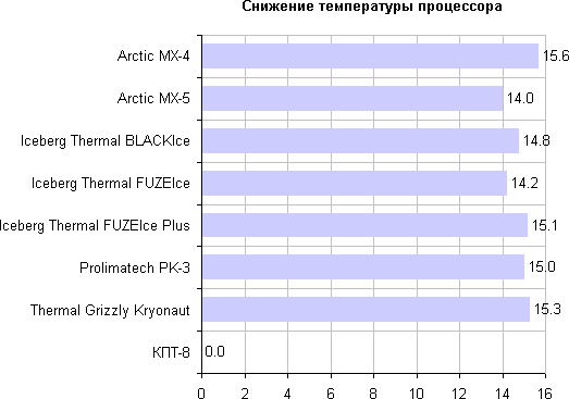 Для более наглядного представления результатов в качестве точки отсчета мы выбрали температуру процессора, полученную при использовании КПТ-8. На представленной диаграмме показано, насколько температура процессора (в условиях нашего теста, конечно) ниже при применении других, отличных от КПТ-8 термоинтерфейсов (больше — лучше):