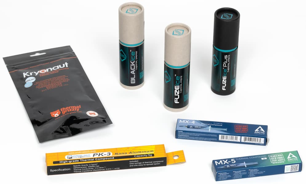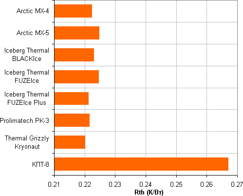 | Название | КПТ-8 | Arctic MX-4 | Arctic MX-5 | Prolimatech PK-3 | Thermal Grizzly Kryonaut |