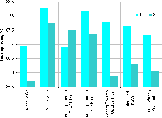 Тестирование выполнялось в два захода. На диаграмме ниже приведены значения температуры процессора, полученные в первом (1) и во втором (2) заходе.