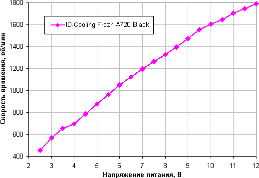Диапазон регулировки с помощью напряжения в данном случае примерно такой же. Вентилятор останавливается при снижении напряжения до 2,0 В и запускается от 2,6 В. Вентилятор вполне допустимо подключать к источнику с напряжением 5 В.