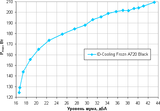 Приняв 25 дБА за критерий условной бесшумности, получим примерную максимальную мощность процессоров типа Intel Core i9-13900K, соответствующих этому уровню, это порядка 179 Вт. Гипотетически, если не обращать внимания на уровень шума, пределы мощности можно увеличить где-то до 210 Вт. Еще раз уточним: это в жестких условиях обдува радиатора нагретым до 44 градусов воздухом и для максимальной температуры процессора в 80 °C (в принципе допустимо 100 °C). При снижении температуры воздуха или увеличении максимально допустимой температуры процессора указанные пределы мощности для бесшумной работы и максимальной мощности возрастают.