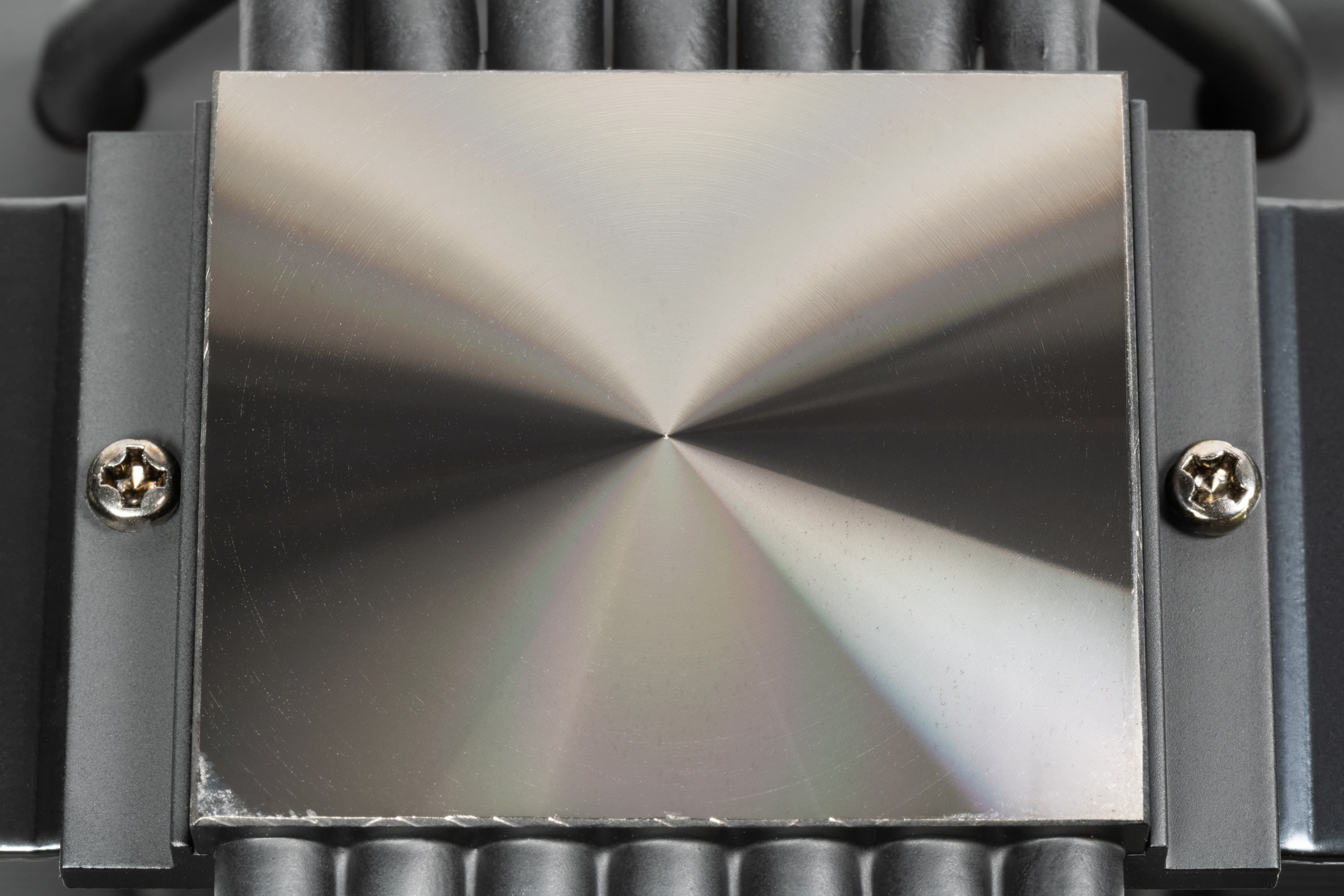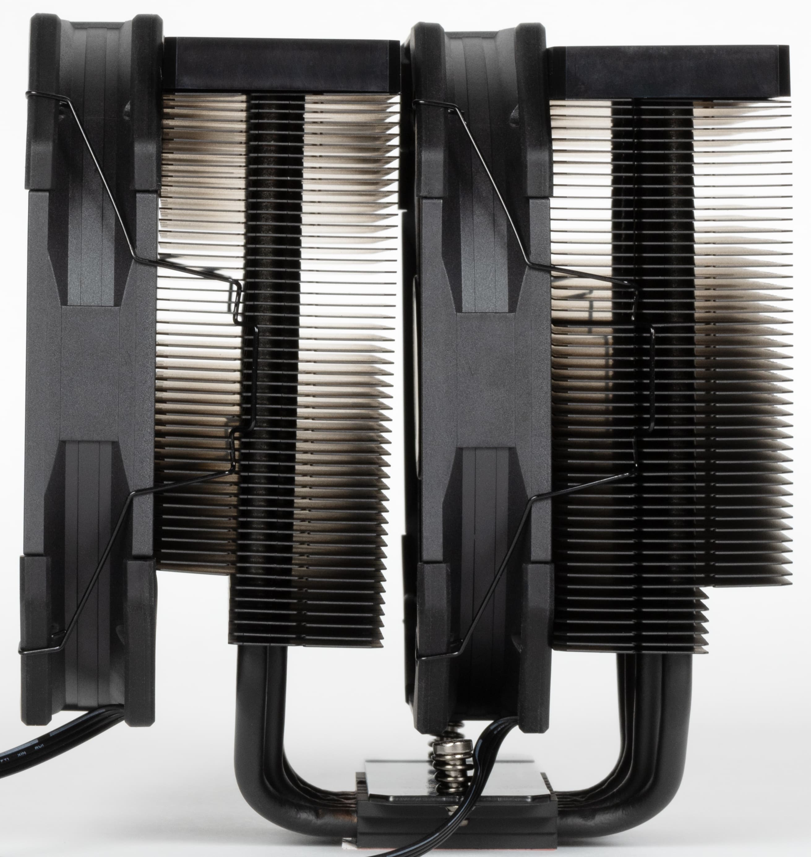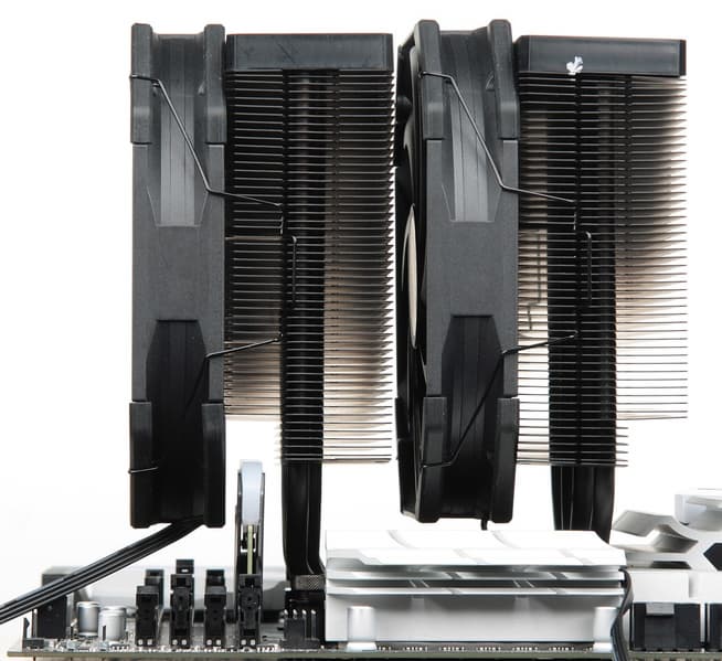 Кулер оснащен двойным вынесенным радиатором, к которому тепло от процессора передается по семи тепловым трубкам. Трубки и нижняя часть теплосъемника медные. Трубки, нерабочая поверхность теплосъемника, пластины радиатора и часть деталей крепежа имеют черное полуматовое лакокрасочное покрытие. Это в какой-то степени улучшает теплоотдачу за счет излучения. Верхняя часть теплосъемника изготовлена из алюминиевого сплава. Трубки к теплосъемнику припаяны. Подошва теплосъемника имеет очень мелкую концентрическую проточку и слегка отполирована. Поверхность подошвы немного выпуклая к центру с перепадом порядка 0,1 мм.