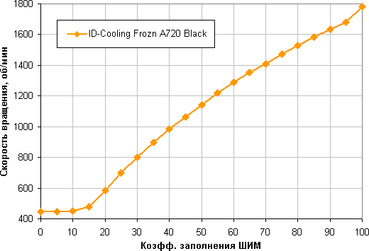 Хороший результат — плавный рост скорости вращения при изменении коэффициента заполнения (КЗ) от 10% до 100% и широкий диапазон регулировки. Отметим, что при КЗ 0% вентилятор не останавливается, поэтому в гибридной системе охлаждения с пассивным режимом на минимальной нагрузке такие вентиляторы придется останавливать, снижая напряжение питания.