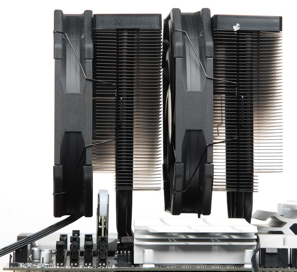 Однако на радиаторе часть пластин имеют уменьшенную глубину, а внешний вентилятор можно сместить вверх, что, согласно нашим измерениям, позволит использовать модули памяти высотой до 61 мм. Если не поднимать вентилятор выше радиатора — до 28 мм.