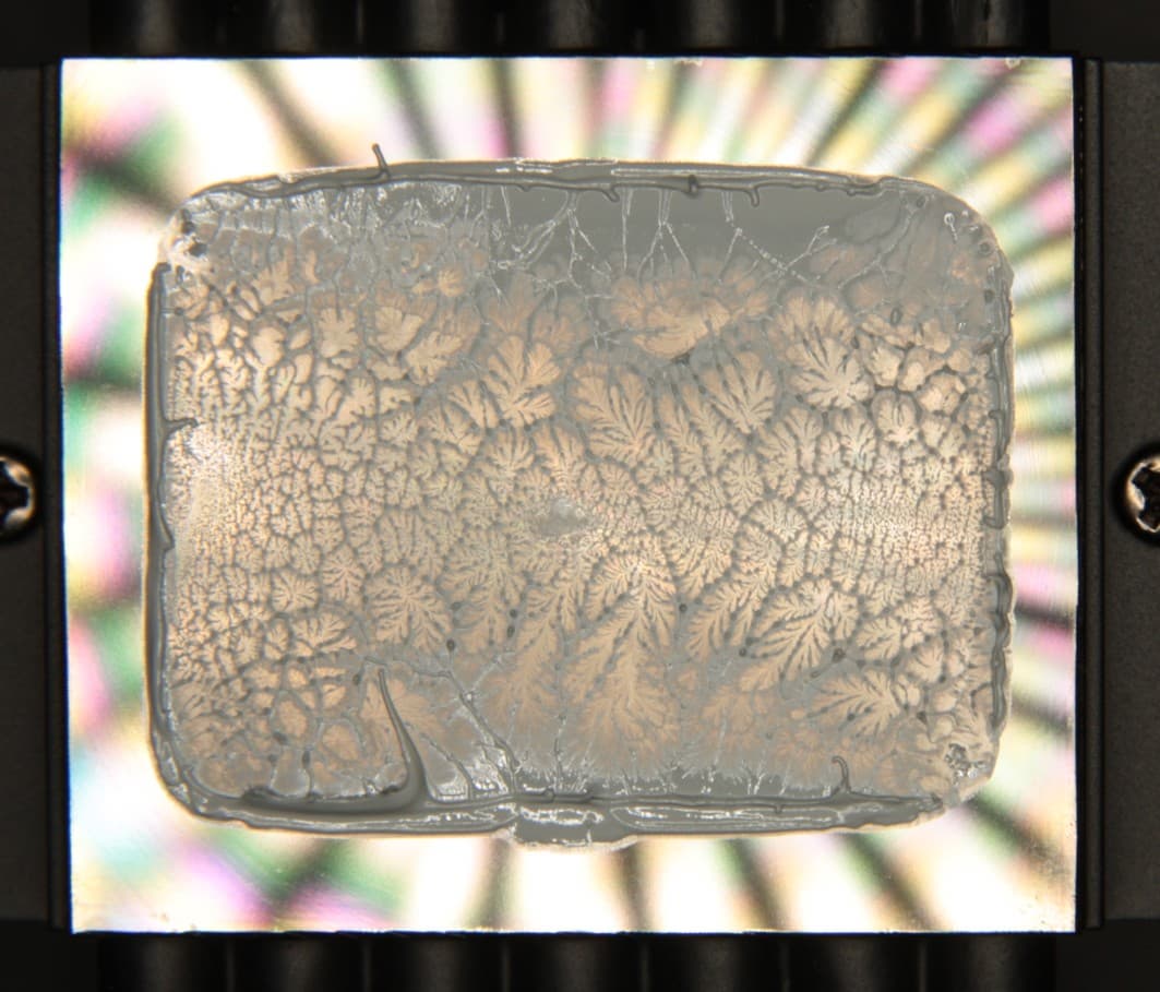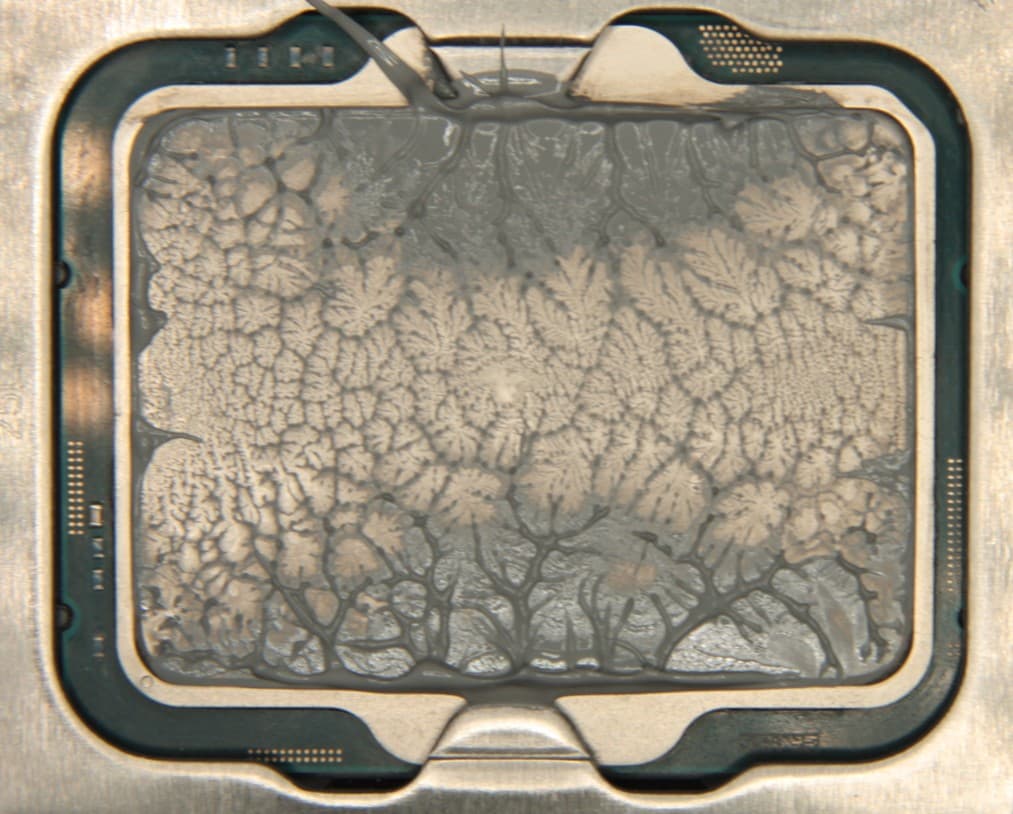 Видно, что термопаста распределилась тонким слоем почти по всей плоскости крышки процессора, а ее избыток выдавился по краям. Пятно плотного контакта большое.