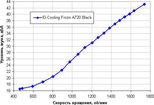 Зависит, конечно, от индивидуальных особенностей и других факторов, но в случае кулеров где-то от 40 дБА и выше шум с нашей точки зрения очень высокий для настольной системы, от 35 до 40 дБА уровень шума относится к разряду терпимых, ниже 35 дБА шум от системы охлаждения не будет сильно выделяться на фоне типичных небесшумных компонентов ПК — вентиляторов корпусных, на блоке питания, на видеокарте, а также жестких дисков, а где-то ниже 25 дБА кулер можно назвать условно бесшумным. Фоновый уровень был равен 16,0 дБА (условное значение, которое показывает шумомер). На максимальной скорости вращения вентиляторов этот кулер довольно громкий.