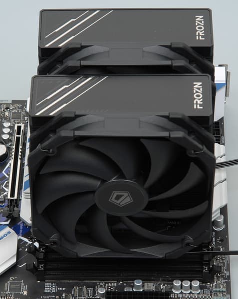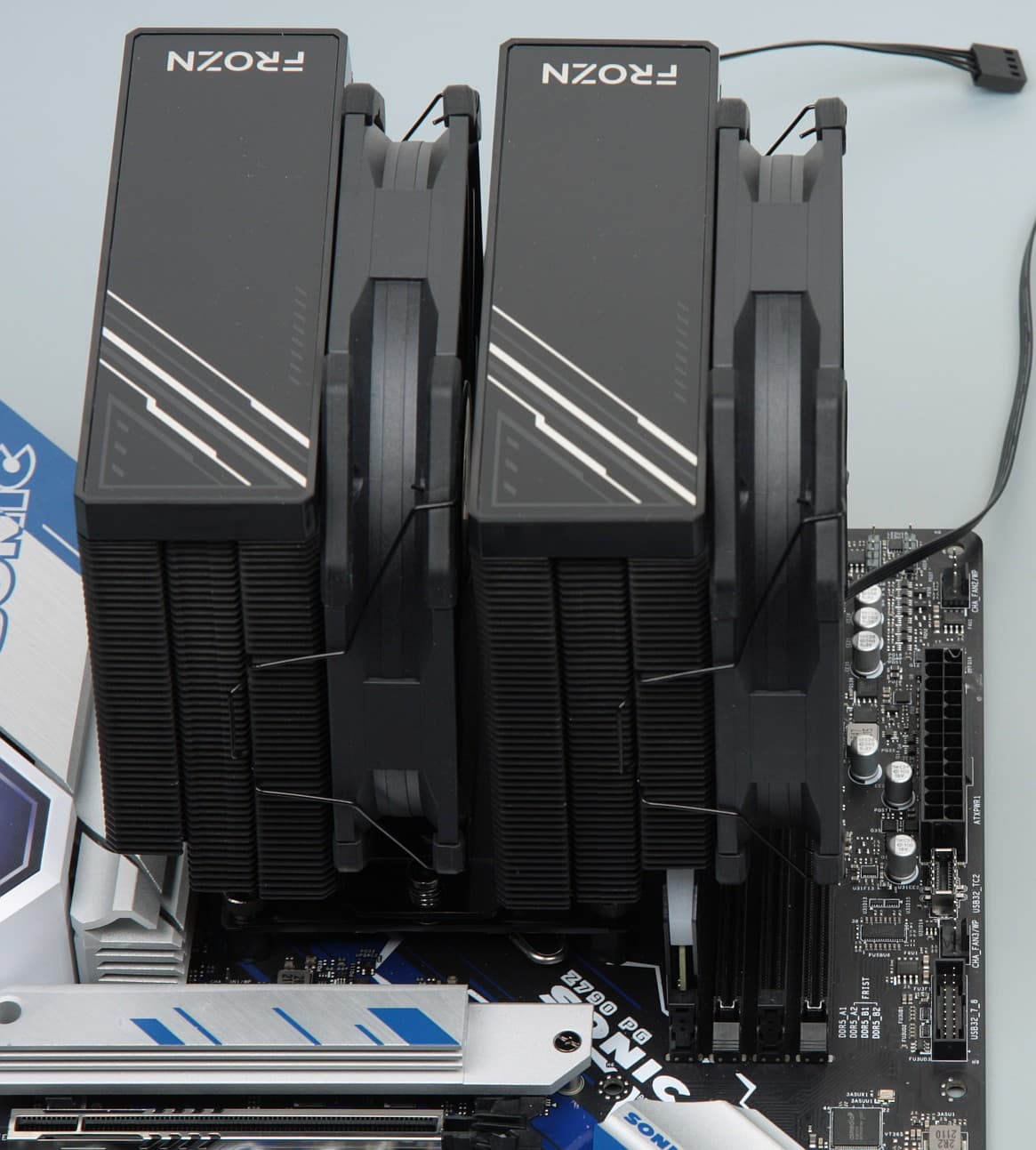 Габариты кулера довольно большие, и, например, в случае LGA1700 все разъемы для оперативной памяти перекрываются сверху радиатором и вентилятором. Например в случае материнской платы ASRock Z790 PG Sonic: