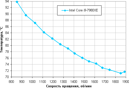 При КЗ = 35% (примерно 940 об/мин) в данных условиях кулер уже не справляется с охлаждением процессора Intel Core i9-7980XE, так как температура отдельных ядер достигает 95 °C (максимальная температура, допустимая на кристалле процессора, равна 94 °C).