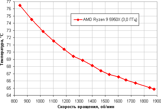 По факту в условиях теста этот процессор при 24 градусах окружающего воздуха не перегревается даже при КЗ равном 30% (а это примерно 840 об/мин вентиляторов), так как максимальная допустимая температура для AMD Ryzen 9 5950X равна 90 °C.