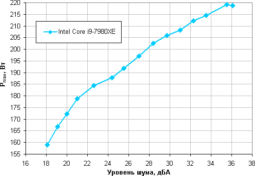 Приняв 25 дБА за критерий условной бесшумности, получим примерную максимальную мощность процессоров, соответствующих этому уровню. Это порядка 190 Вт для процессора Intel Core i9-7980XE. Если не обращать внимания на уровень шума, то пределы мощности можно увеличить где-то до 220 Вт. Еще раз уточним, это в жестких условиях обдува радиатора нагретым до 44 градусов воздухом, при снижении температуры воздуха указанные пределы мощности для бесшумной работы и максимальной мощности возрастают.