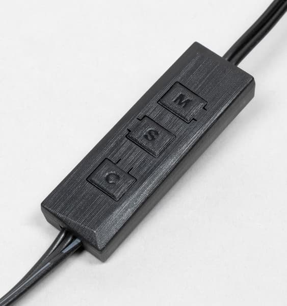 Кабель питания контроллера подключается с помощью разъема питания SATA, что гораздо удобнее, чем к периферийному разъему («Molex»). Кнопкой контроллера «M» перебираются режимы, кнопкой «S» выбирается скорость для динамичных режимов, кнопка «C» служит для выбора цветов в некоторых режимах. Режимы подсветки с некоторыми вариантами настроек можно посмотреть на видео ниже: