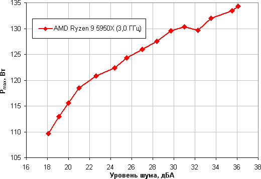 Приняв 25 дБА за критерий условной бесшумности, получим, что максимальная мощность процессора, соответствующая этому уровню, составляет порядка 123 Вт. Если не обращать внимания на уровень шума, то предел мощности можно увеличить где-то до 134 Вт. Еще раз уточним: это в жестких условиях обдува радиатора нагретым до 44 градусов воздухом. При снижении температуры воздуха указанные пределы мощности для бесшумной работы и максимальной мощности возрастают. Поэтому при условии достаточно хорошей вентиляции в корпусе данный кулер как-то справится с охлаждением процессора AMD Ryzen 9 5950X, но на возможность существенного разгона рассчитывать уже не стоит.