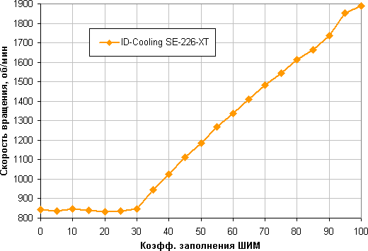 Хороший результат — плавный рост скорости вращения при изменении коэффициента заполнения (КЗ) от 30% до 100% и довольно широкий диапазон регулировки. Отметим, что при КЗ 0% вентилятор не останавливается, поэтому в гибридной системе охлаждения с пассивным режимом на минимальной нагрузке такие вентиляторы придется останавливать, снижая напряжение питания.