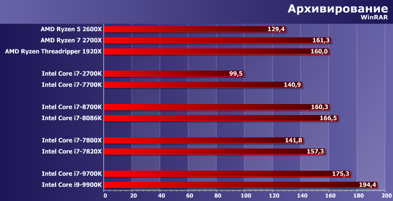 Простой целочисленный код, где качество ядер не имеет значение — главное количество. И SMT в таких условиях выдает максимум возможного. В итоге перед нами единственный случай, когда i7-9700К не удалось обогнать i7-8700K — получилось как в анекдоте: «восемь ядер — это, конечно, восемь ядер, но 12 потоков — это 12 потоков». А остальные результаты в подробных комментариях не нуждаются — все понятно.