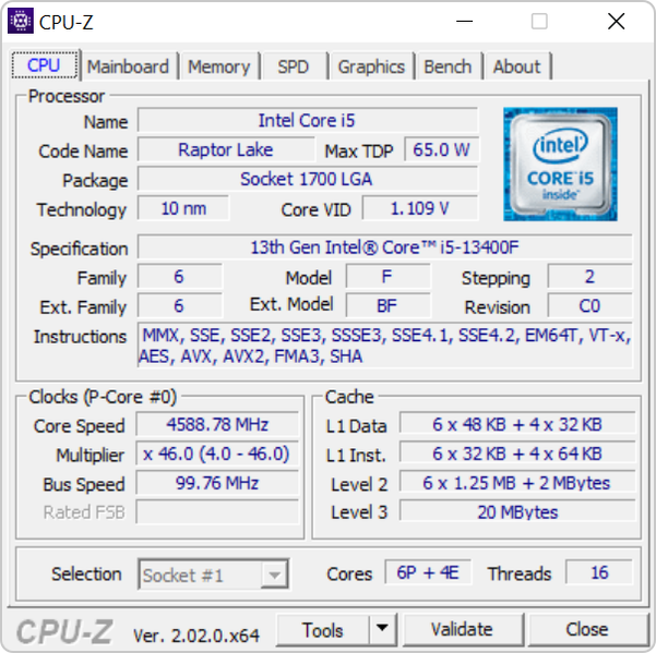 Так как рассматриваемый сегодня CPU использует кристалл Alder Lake, то максимальная официальная частота памяти для него DDR5-4800, а объем L2-кэша в 9,5 МБ и L3-кэша в 20 МБ полностью аналогичны параметрам Core i5-12600K предыдущего поколения. Кристалл степпинга C0 — тот же, который компания использовала в процессорах Core i5 поколения Alder Lake, и поэтому Core i5-13400(F) почти идентичен Core i5-12600K.