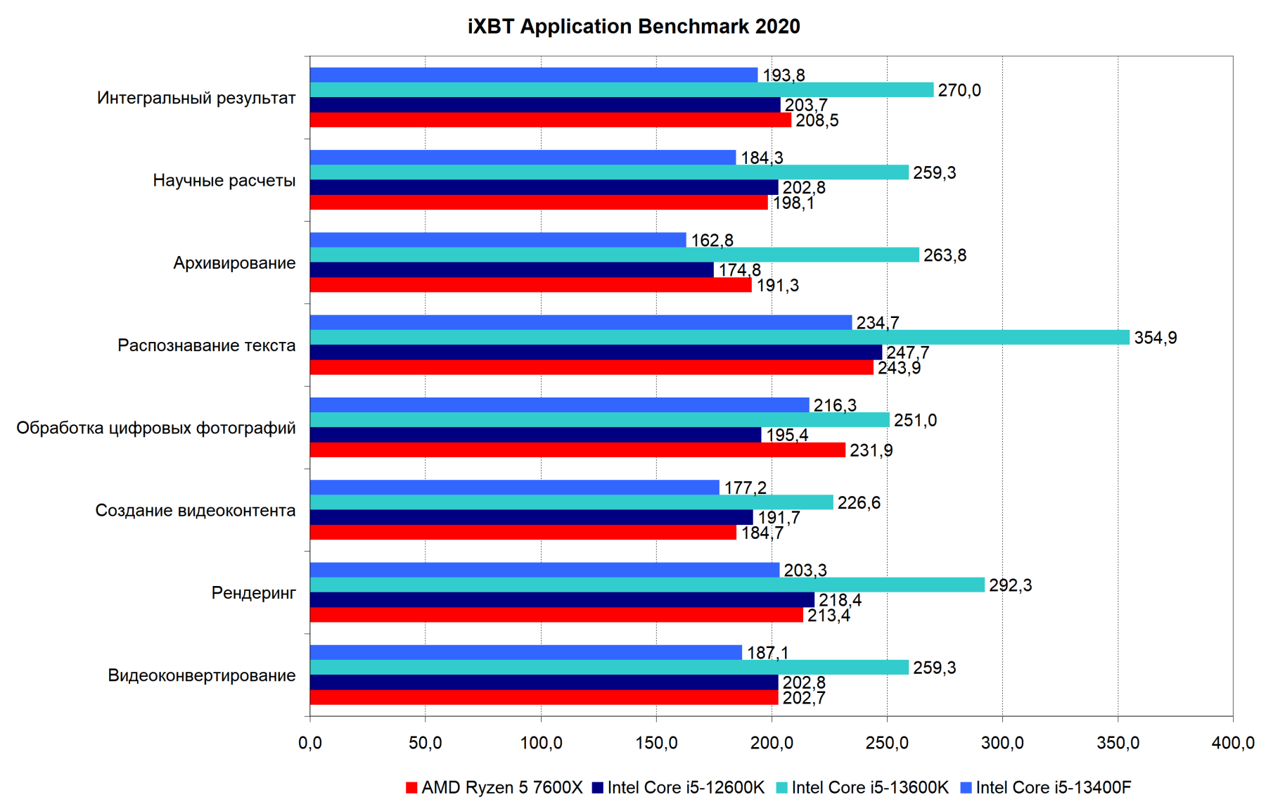 Сравнительная производительность конкурирующих друг с другом процессоров Core и Ryzen зависит от задачи, в каких-то приложениях процессор Intel быстрее, в других впереди продукт AMD, ну а средняя разница между ними не превышает нескольких процентов, что видно по результатам iXBT Application Benchmark для Core i5-12600K и Ryzen 5 7600X. Но сегодня мы рассматриваем Core i5-13400(F), и он нас смог удивить — в основном, не слишком приятно, хотя мы и предполагали, что аналогичный по архитектуре процессор со сниженными частотами уступит Core i5-12600K.