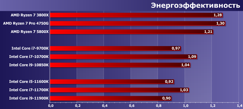 Тем более, что соревноваться приходится не только с предшественниками, но и с Ryzen — а у них сейчас по техпроцессу преимущество. В итоге и энергоэффективность намного выше. У Rocket Lake с этим все хуже. Хотя некоторые модели относительно неплохи — младшие Core i5 и, как раз, Core i7-11700K. Возможно, что и других новых Core i7 это тоже будет касаться, что объяснимо — они все сейчас в немалой степени младшие. Тот же кристалл в более жестком режиме дает Core i9. «Щадящие» настройки лишь незначительно сказываются на производительности, но существенно — на энергопотреблении.