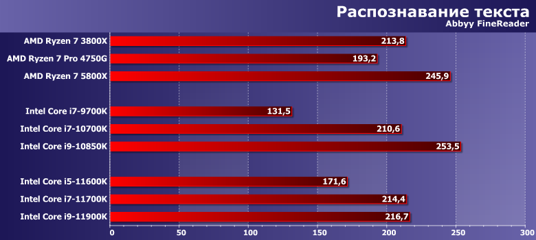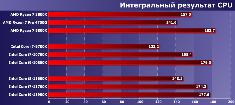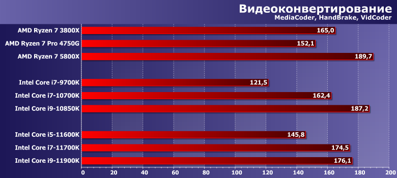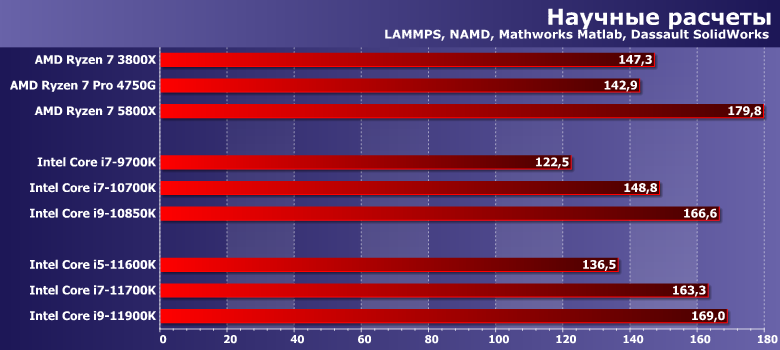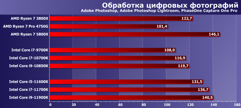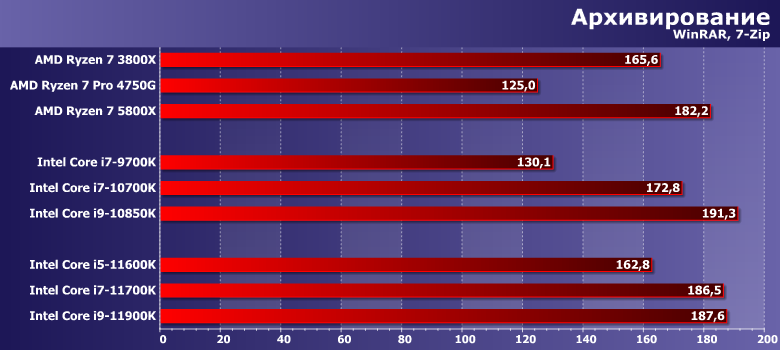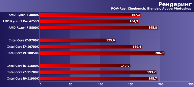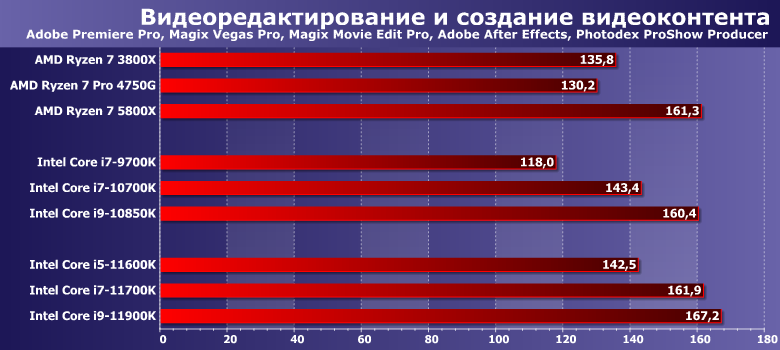Без существенных изменений. Разве что в этих программах Cypress Cove можно и вовсе уравнять с Zen3, но... У AMD есть модели с существенно большим количеством ядер, да и Core i9 «десятого поколения» по этой же причине хоть немного, но впереди (хотя после освоения AVX512 картина может и измениться — но на это нужно время, ввиду традиционной тормознутости программистов). Опять же — последние тоже могут обходиться без дискретной видеокарты, да и поставки APU на базе Zen3 не за горами — причем AMD обещает куда большую доступность этих моделей, нежели для 4000-го семейства. Так что получилось неплохо. Но хотелось бы большего.
