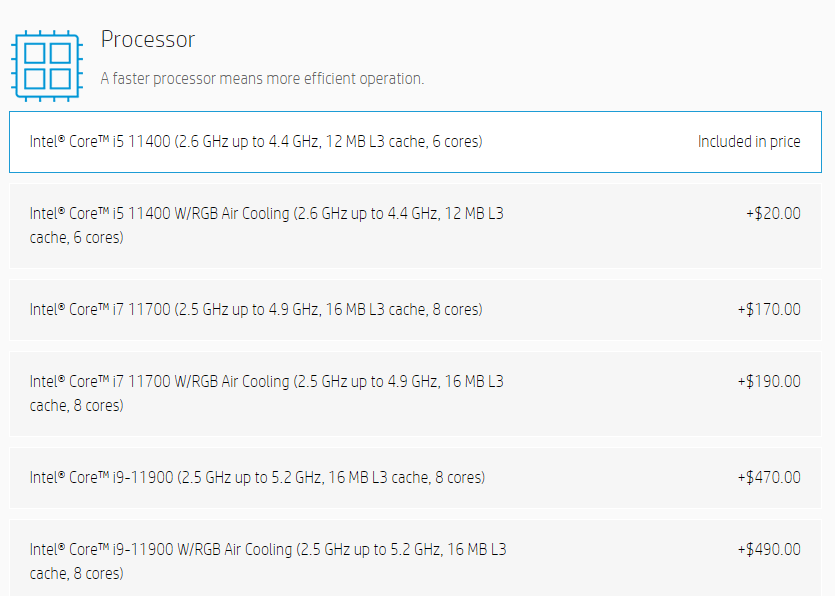 Вот так, к примеру, выглядел на момент тестирования конфигуратор HP Omen 25L Desktop GT12-1335qd. Переход с Core i5-11400 (RCP $182) на i7-11700 (RCP $322-$333) обойдется покупателю (при прочих равных) в 170 долларов — сопоставимо с «официальной» разницей между процессорами. А вот замена на Core i9-11900 потянет уже на $470 — хотя сам процессор согласно прайс-листу Intel вообще-то дешевле этой суммы (да и i5-11400 тоже не бесплатный). В общем, престиж стоит дорого. Но дает ли что-то осязаемое? Проверим.