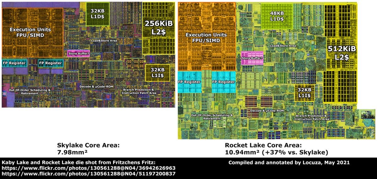 В целом такая сборная солянка под единой маркой Comet Lake неплохо справлялась со своими обязанностями почти до конца года — звезд с неба не хватала, но с Zen2 конкурировать могла. За исключением, конечно, Ryzen 9 — но этим процессорам противостояли уцененные Core i9 для LGA2066. А дальше эстафету в настольном сегменте должен был подхватить Rocket Lake — и принести первое радикальное обновление микроархитектуры за много лет. Впрочем, уже не принципиально новой — ядра Sunny Cove использовались и в мобильных Ice Lake, производимых как раз по многострадальным нормам 10 нм. Но и эта версия техпроцесса еще не подходила для массового использования, так что в Intel предпочли ее дошлифовать именно в мобильных решениях, причем сначала ограничиваясь все теми же четырьмя ядрами, а многоядерные настольные решения выпускать по старым нормам. И сразу же стало понятно — почему компания так долго откладывала это кажущееся простым и логичным обновление. Площадь ядра Skylake составляет 7,98 мм², каждое новое (более сложное) ядро при сохранении тех же норм занимает уже 10,94 мм². При этом подросли и прочие блоки: например, линий PCIe уже не 20, а 28, причем контроллер поддерживает уже четвертую, а не третью версию спецификации, на что тоже дополнительные транзисторы требуются. В общем, даже на 10 нм восьмиядерные Tiger Lake «очень большие», а 14-нанометровые Rocket Lake — вообще на грани разумного.