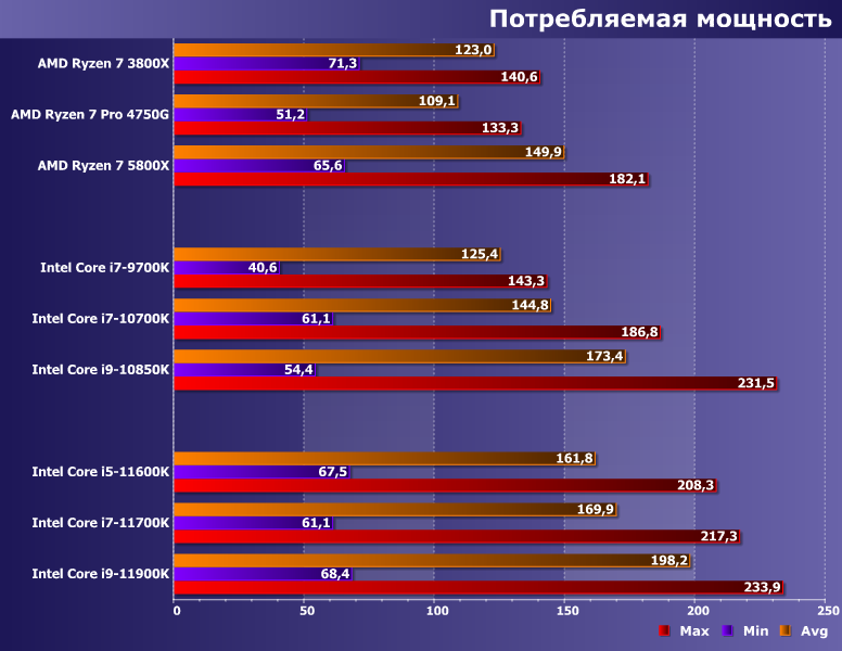 Еще один серьезный недостаток Rocket Lake даже сравнительно с предшественниками — очень высокое энергопотребление. Именно из-за него компания оттягивала модернизацию архитектуры до последнего. Точнее, в точном соответствии с изначальными планами увязала ее с новыми техпроцессами — портировав на старые лишь от безысходности. С которой, конечно, вскоре будет покончено (сейчас уже компания отгружает больше 10-нанометровых чипов, чем 14-нанометровых), но это будет уже на новой платформе — какие-то обновления LGA1200 не планируются. Эта платформа во многом и нужна была для того, чтобы улучшить питание многоядерных чипов, но даже шестиядерные Rocket Lake «выжирают» весь запас почти без остатка, а для восьмиядерных и новые возможности уже оказываются ограничениями. Однако Core i7 и Core i9 ведут себя немного по-разному — вторым нужно было догнать и перегнать «старые» десятиядерные модели любой ценой, а от первых это не требовалось. Впрочем, как мы видели выше, «догнать» по энергопотреблению удалось легко, а вот по производительности — когда как. Так что лучше было бы подобную гонку и не начинать.