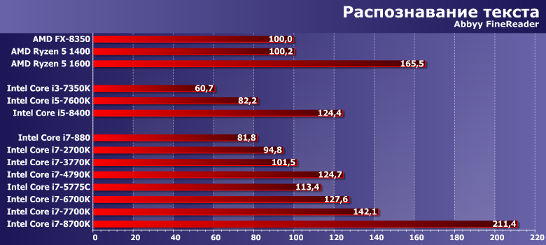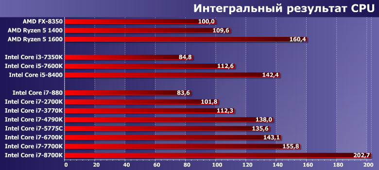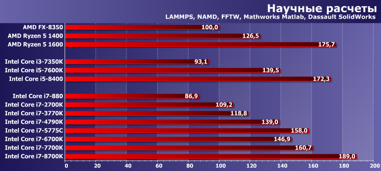 Все отличие от предыдущей группы — код здесь не столь примитивен, так что, кроме ядер, потоков и гигагерцев, важны и архитектурные особенности выполняющих его процессоров. Хотя общий итог для продукции Intel «навскидку» вполне сопоставимый: по-прежнему двукратная разница между 880 и 7700K, по-прежнему i5-8400 уступает лишь последнему, по-прежнему i3-7350K не догнал никого. И произошло это за те же семь лет. Можно считать, что и восемь — все-таки LGA1156 на рынок вышла осенью 2009 года, а Core i7-880 от появившихся в первой волне 860 и 870 отличался лишь частотами, да и то немного.
