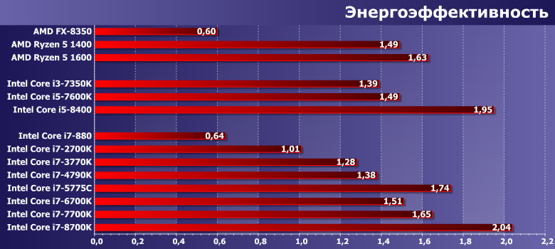 В принципе, утверждения поклонников AMD о том, что в «суровом многопотоке» FX были не так уж и плохи, если рассматривать только производительность, основания имеют: как видим, 8350 в принципе мог на равных конкурировать с Core i7 того же года выпуска. Впрочем, здесь он и на фоне младших Ryzen неплохо смотрится, а вот между этими двумя семействами практически ничего компанией для этого сегмента рынка не выпускалось. У Intel же наблюдается равномерная такая линейка, позволившая и в рамках «четырехъядерной» концепции удвоить производительность. Хотя ядра здесь имеют огромное значение — лучший двухъядерник 2017 года все равно не догнал четырехъядерный Core «предыдущего» поколения (напомним, что так оно официально и называется до сих пор в материалах компании, четко отделяясь от пронумерованных начиная от второго). И шестиядерные модели хороши — причем все. Так что упреки Intel в том, что компания слишком задержала их выход на рынок, можно считать в какой-то степени справедливыми.