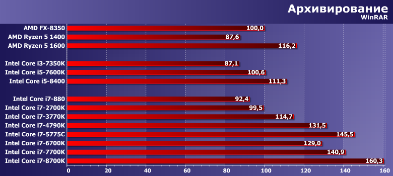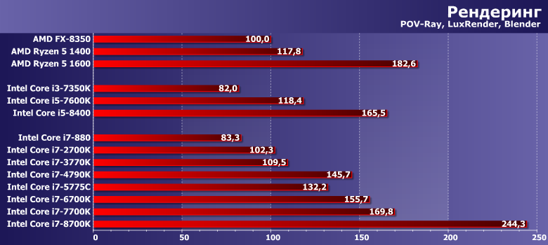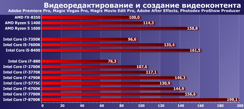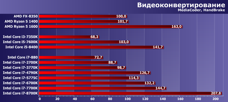 Без процессоров AMD обойтись никак нельзя, да и незачем. Включая и «исторический» FX-8350, являющийся ровесником Core i7-3770K. Болельщики этой линейки всегда утверждали, что он не только дешевле, но и вообще лучше — просто готовить его мало кто умеет. А вот если воспользоваться «правильными программами», то сразу всех обгонит. Мы с этого года как раз по просьбам трудящихся переработали методику тестирования в сторону «сурового многопотока», так что есть повод проверить эту гипотезу — все равно тестирование историческое. А современных моделей потребуется как минимум две. Нам бы очень подошел Ryzen 5 1500Х, очень похожий на старые Core i7, но его не тестировали. Ryzen 5 1400 формально тоже подходит... но фактически у этой модели (и у современных Ryzen 3) вместе с уполовиниванием кэш-памяти «пострадали» и связки между ССХ. Поэтому пришлось взять еще и Ryzen 5 1600, где этой проблемы нет — в результате чего и обгоняет 1400 зачастую более, чем в полтора раза. Да и пара шестиядерных процессоров Intel в сегодняшнем тестировании тоже присутствует. Прочие явно слишком медленны для сравнения с этим недорогим процессором, ну и ладно — пусть подоминирует.