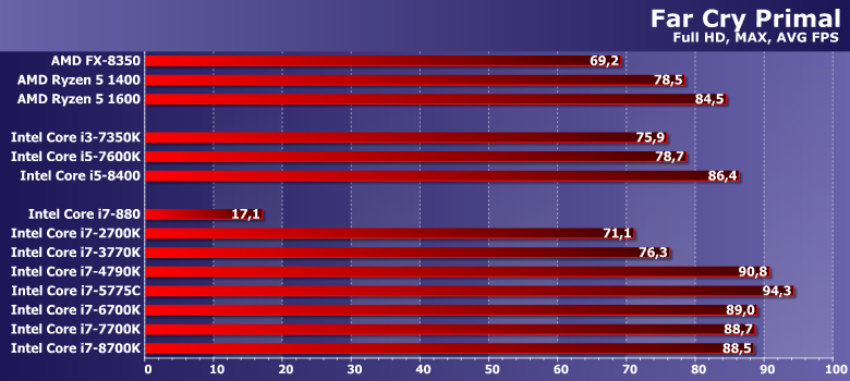 Вот, к примеру, Far Cry Primal. Сразу отбрасываем результаты Core i7-880: очевидна некорректная работа видеокарты на GTX 1070 с этой платформой. Возможно, кстати, это же распространимо и на LGA1155, хотя в целом частоту кадров тут низкой не назовешь: на практике достаточно. Но явно ниже, чем могло бы быть. И LGA1151 тоже как-то не блещет, а лучшей платформой выглядит LGA1150. Теперь вспоминаем, что модифицированная версия движка Dunia Engine 2 (здесь он как раз и используется) разрабатывалась между 2013 и 2014 годом, так что могли как раз и просто дооптимизироваться. Косвенным подтверждением чего являются и невысокая (относительно ожидаемой) частота кадров на Ryzen 5: вот есть ощущение, что должно быть больше, и все тут.